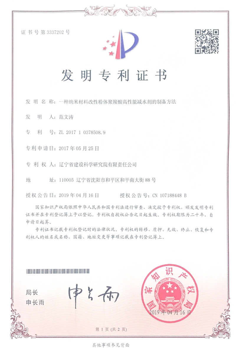證書---一種納米材料改性粉體聚羧酸高性能減水劑的制備方法